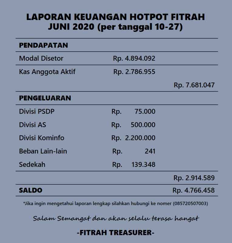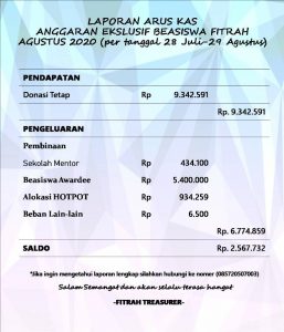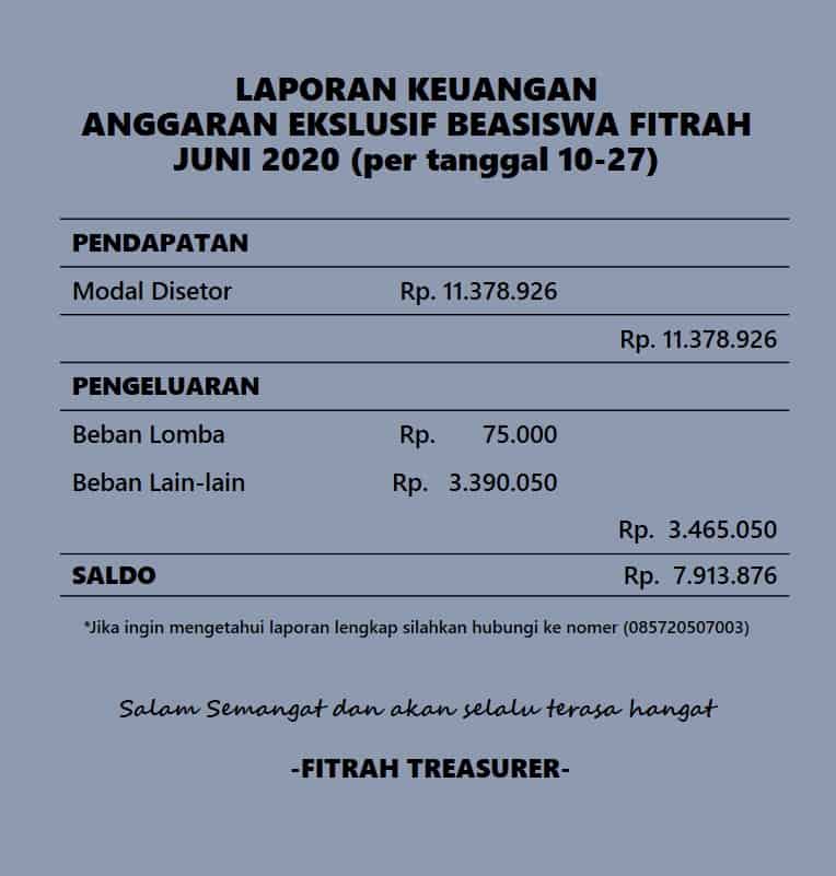 LAPORAN KEUANGAN Juni 2020 Operasional FITRAH Beasiswa FITRAH Juli 2020 Operasional FITRAH Beasiswa FITRAH Agustus 2020 Operasional FITRAH Beasiswa FITRAH September 2020 Operasional FITRAH Beasiswa FITRAH Oktober 2020 Operasional FITRAH Beasiswa FITRAH November 2020 Operasional FITRAH Beasiswa FITRAH Ingin berkontribusi hanya dengan 25k? Donasi Program